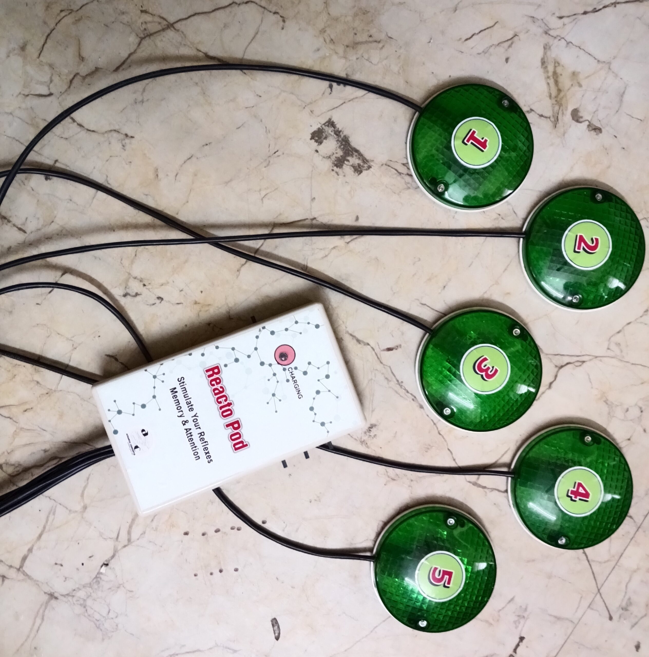 Reacto Pods is an interactive neuro-rehabilitation device designed to enhance neuroplasticity, reaction time, coordination, and cognitive-motor integration in patients recovering from stroke, brain injury, or neurological disorders